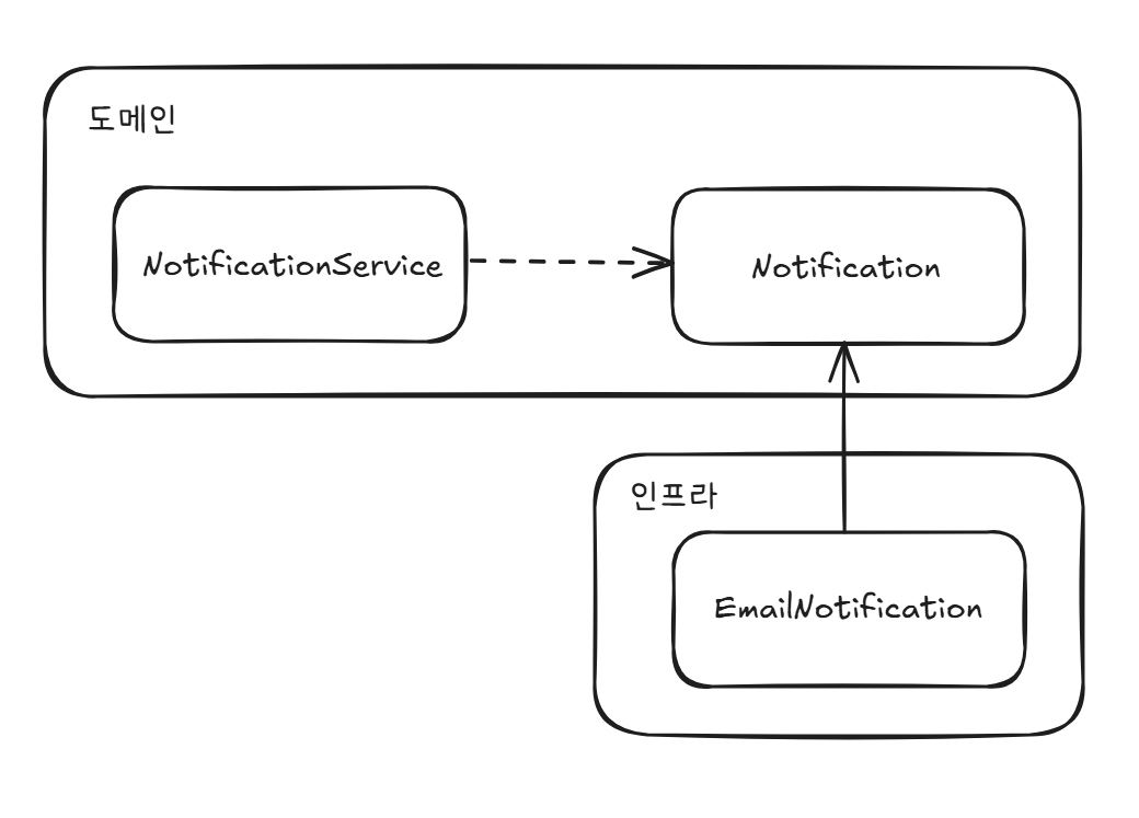 - NotificationService는 EmailNotification에 직접 의존 → EmailNotification을 변경하면 NotificationService도 변경해야 함